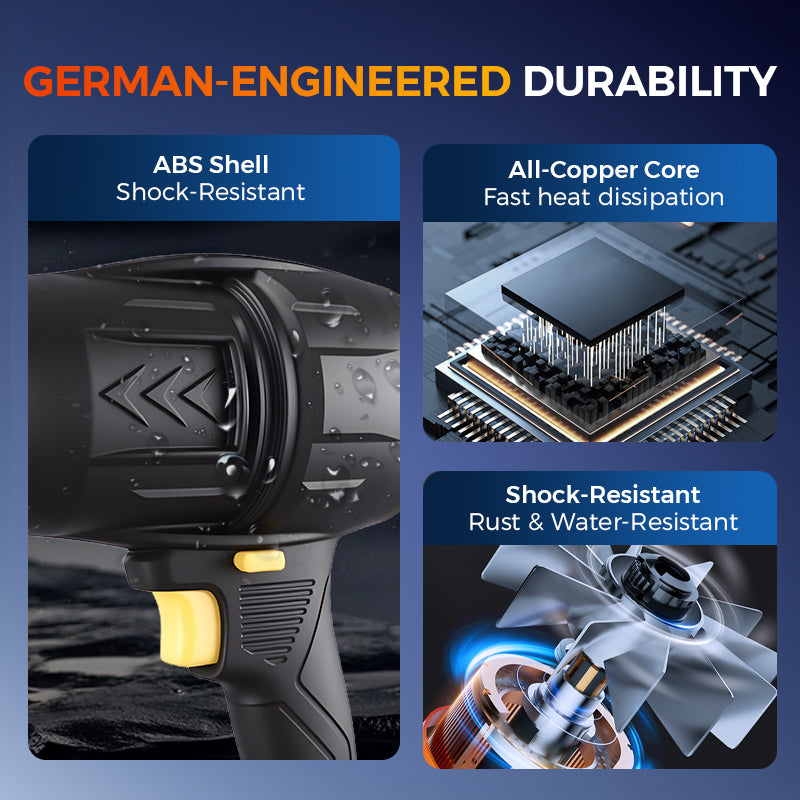 HIGH-POWER ALL-COPPER MOTOR: The fan’s all-copper motor and 12 wind blades deliver powerful airflow for efficient cooling and cleaning. It ensures long-lasting durability and high performance. Perfect for both personal cooling and heavy-duty tasks.